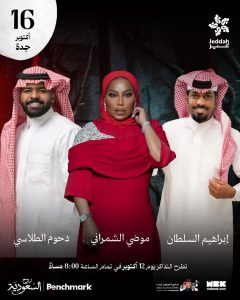 تستعد مدينة جدة لاستقبال أمسية فنية مميزة يوم 16 أكتوبر، تجمع ثلاثة من نجوم الغناء السعودي: موضي الشمراني، إبراهيم السلطان، ودحوم الطلاسي، في ليلة تحمل الطابع الشعبي والطربي الأصيل، بتنظيم شركة بنش مارك ضمن فعاليات موسم جدة.