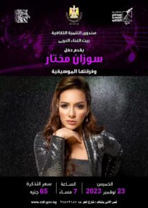 تحيى الفنانة سوزان مختار وفرقتها الموسيقية، حفلا غنائيا جديدا، وذلك في السابعة من مساء اليوم الخميس ، في قصر الأمير بشتاك “بيت الغناء العربي” بشارع المعز.