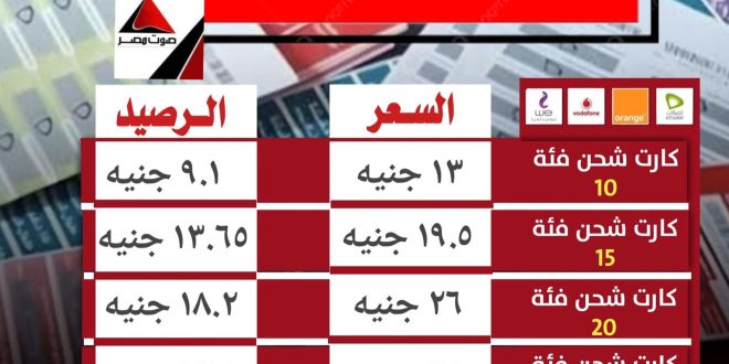 كارت الشحن فئة ٢٠ جنيها أصبح بــ٢٦جنيها، ويعطى رصيد ١٨.٢ جنيه
