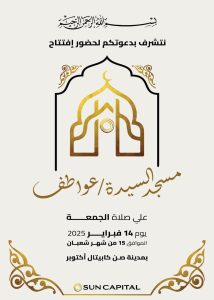 افتتاح مسجد السيدة عواطف مصباح بصن كابيتال بمدينة حدائق أكتوبر اليوم الجمعة الموافق النصف من شعبان والذي شهد حضور اللواء أمير سيد أحمد مستشار السيد رئيس الجمهورية للتخطيط العمراني و الدكتور أسامة الأزهري وزير الأوقاف والمهندس شريف الشربيني وزير الإسكان والمرافق والمستشار محمود فوزي وزير المجالس النيابية والقانونية والدكتور إبراهيم صابر محافظ القاهرة والنائب طارق شكري عضو مجلس النواب والشيوخ السيد مسعد وكيل وزارة الأوقاف بالجيزة والنائب عبد الوهاب خليل عضو مجلس النواب، نائب رئيس الهيئة البرلمان لحزب مستقبل وطن،والنائب هشام حسين عضو مجلس النواب