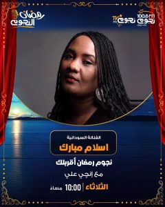 تستضيف الليله الاعلاميه المتالقه أنجى على فى برنامج نجوم رمضان أقرب لك الفنانه السودانيه اسلام مبارك على محطه وراديو نجوم FM الليله الساعه العاشرة مساءا على الهواء مباشرة شاركت الفنانه السودانيه اسلام مبارك فى مسلسل أشغال شاقه جدا وجسدت اسلام مبارك دور مدينه كما شاركت فى فيلم ستموت فى العشرين والذى مثل السودان فى مهرجان الاوسكار كما شاركت فى فيلم ضى من اخراج كريم الشناوى برنامج نجوم رمضان اقرب يذاع من الاحد الى الاربعاء الساعه العاشرة مساءا على محطه وراديو نجوم FM