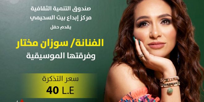تحيى المطربة سوزان مختار وسط الآثار المصرية بشارع المعز ببيت السحيمي من خلال حفل غنائي يوم الاربعاء ٢٣ أبريل الساعة الثامنة مساء، والحفل يقدم في إطار الحفلات التي يقدمها صندوق التنمية الثقافية بمراكز الإبداع المختلفة بجمهورية مصر العربية، والحفل يقدم بمشاركة الفرقة الموسيقية الخاصة بالفنانة سوزان مختار، وستقدم خلال الحفل باقة متنوعة من أغاني مطربي الزمن الجميل، ومنهم علي سبيل المثال: نجاة ووردة وشادية وام كلثوم و محمد عبد المطلب وعبد الوهاب وعبد الحليم وآخرين ، كما ستقدم عدد من أغانيها الخاصة التي قدمتها خلال الفترة الماضية ومنها فاتك تشوف من الاخر كده تعيشى يا مصر
