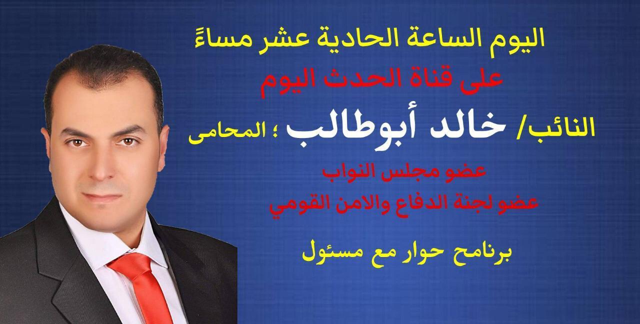 يحل اليوم النائب والمحامى الكبير خالد أبوطالب عضو لجنه الدفاع والأمن القومى بمجلس النواب ضيفا فى برنامج حوار مع مسئول على قناه الحدث الساعه الحاديه عشر مساءاً الليله